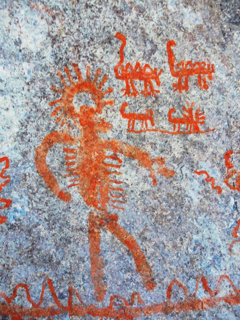 Although the old man had not visited the site in 50 years we set off to find the cave paintings. The old man was incredible - it was an upward climb, which did take us about 4 hours to reach. I did not think I would make it, but I did. What we found was an overhanging ledge - not a cave. And on the walls there were these rust colored drawings. There were not many and not large. However, there were figures of people, insects, and animals. One figure had a torso that looked like a centipede insect. Around him were animal and insect representations. One was a scorpion. Below the Insect Man were three Indians that appeared to be dancing.
